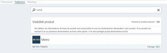 Si le produit concerné est indiqué en tant que “Produit exclusif”, vous recevrez une demande de partage de ce produit et devrez activer manuellement le destinataire concerné dans l’onglet “Publication” de votre fiche produit.